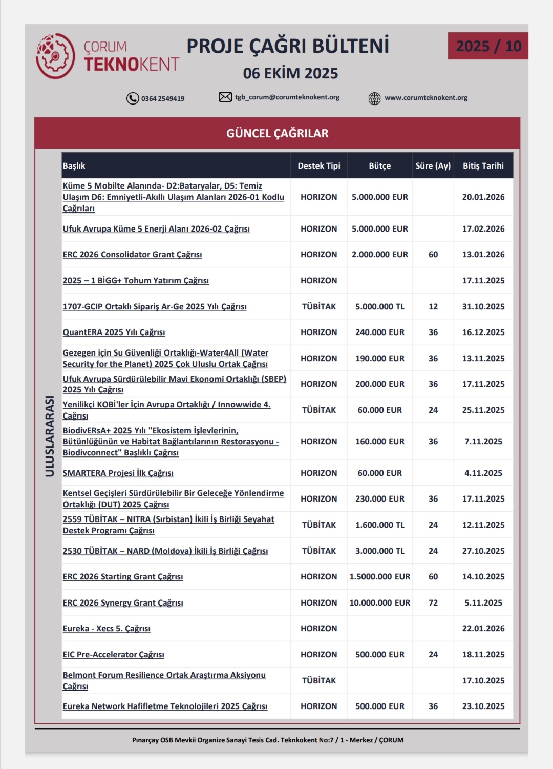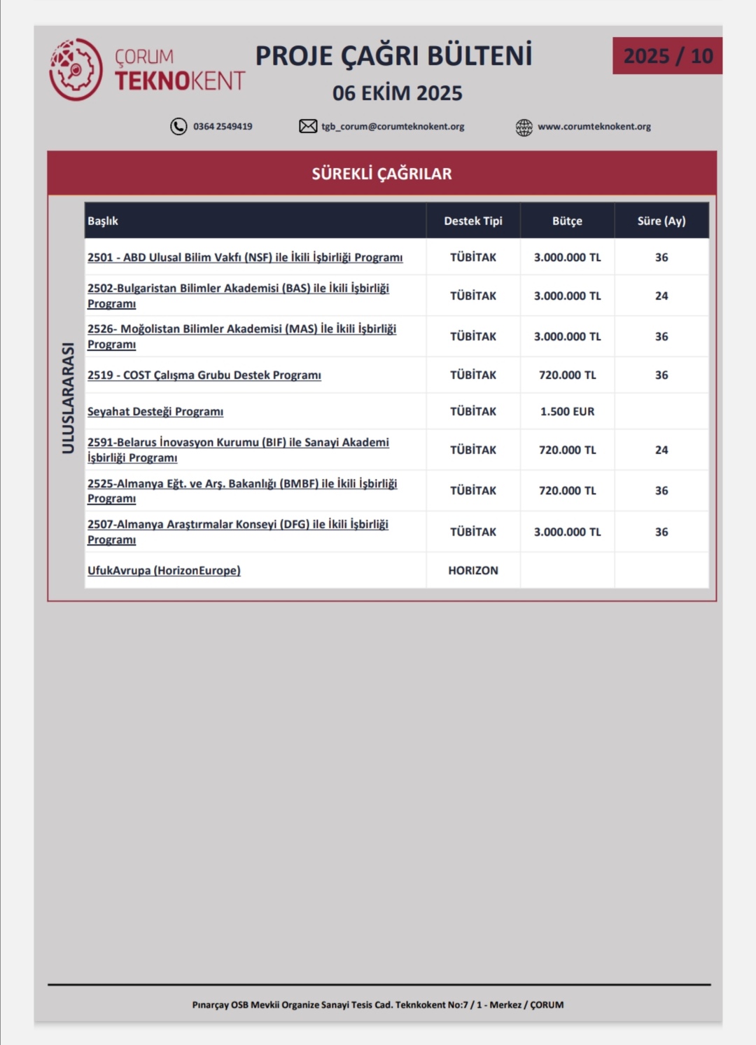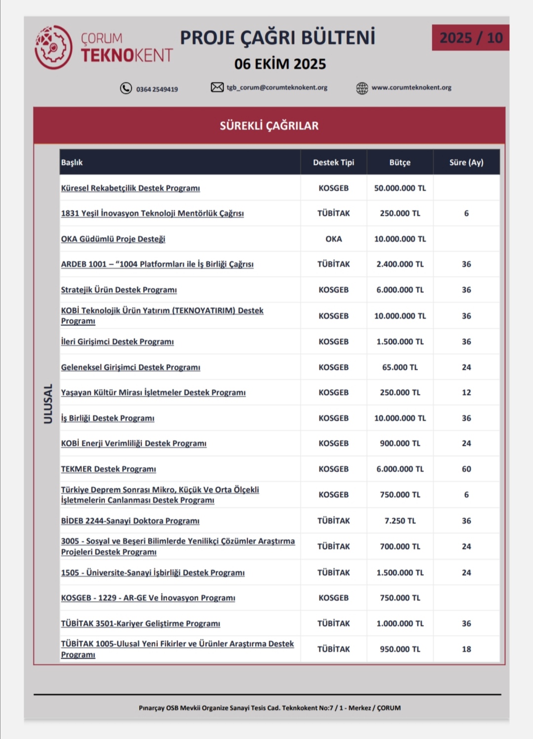 Yeni fırsatlar sizi bekliyor! Ekim2025 Proje Çağrı Bülteni yayımlandı. Ar-Ge’den girişimciliğe, sağlık teknolojilerinden ihracat desteklerine kadar birçok programla projelerinizi hayata geçirin!