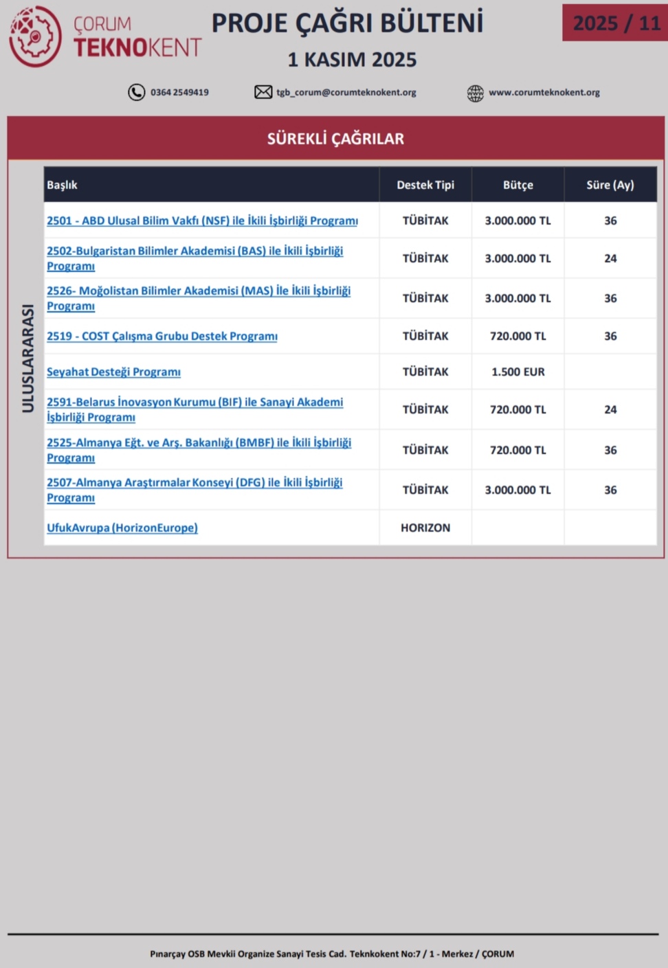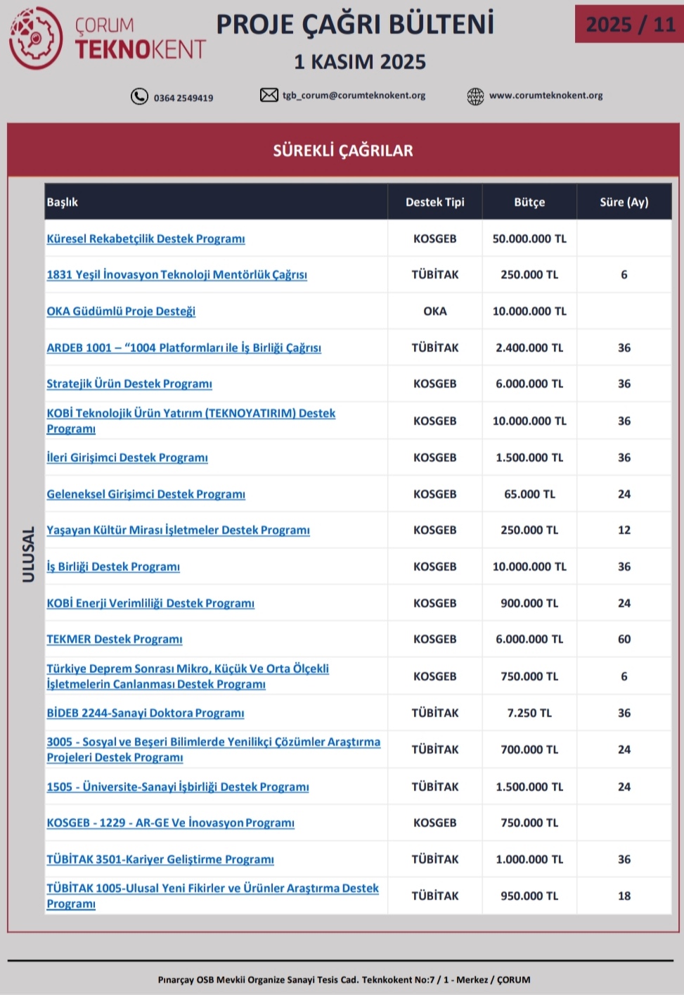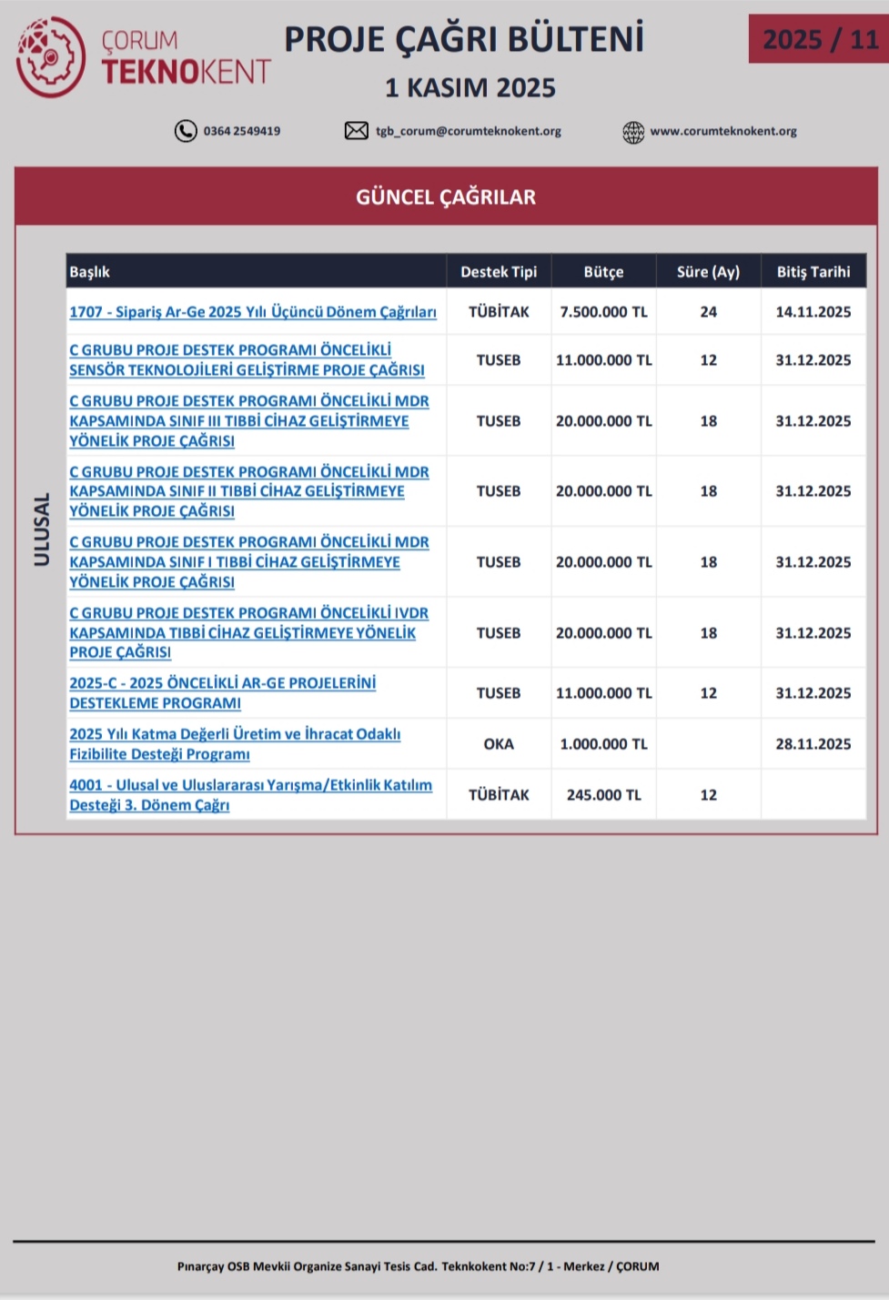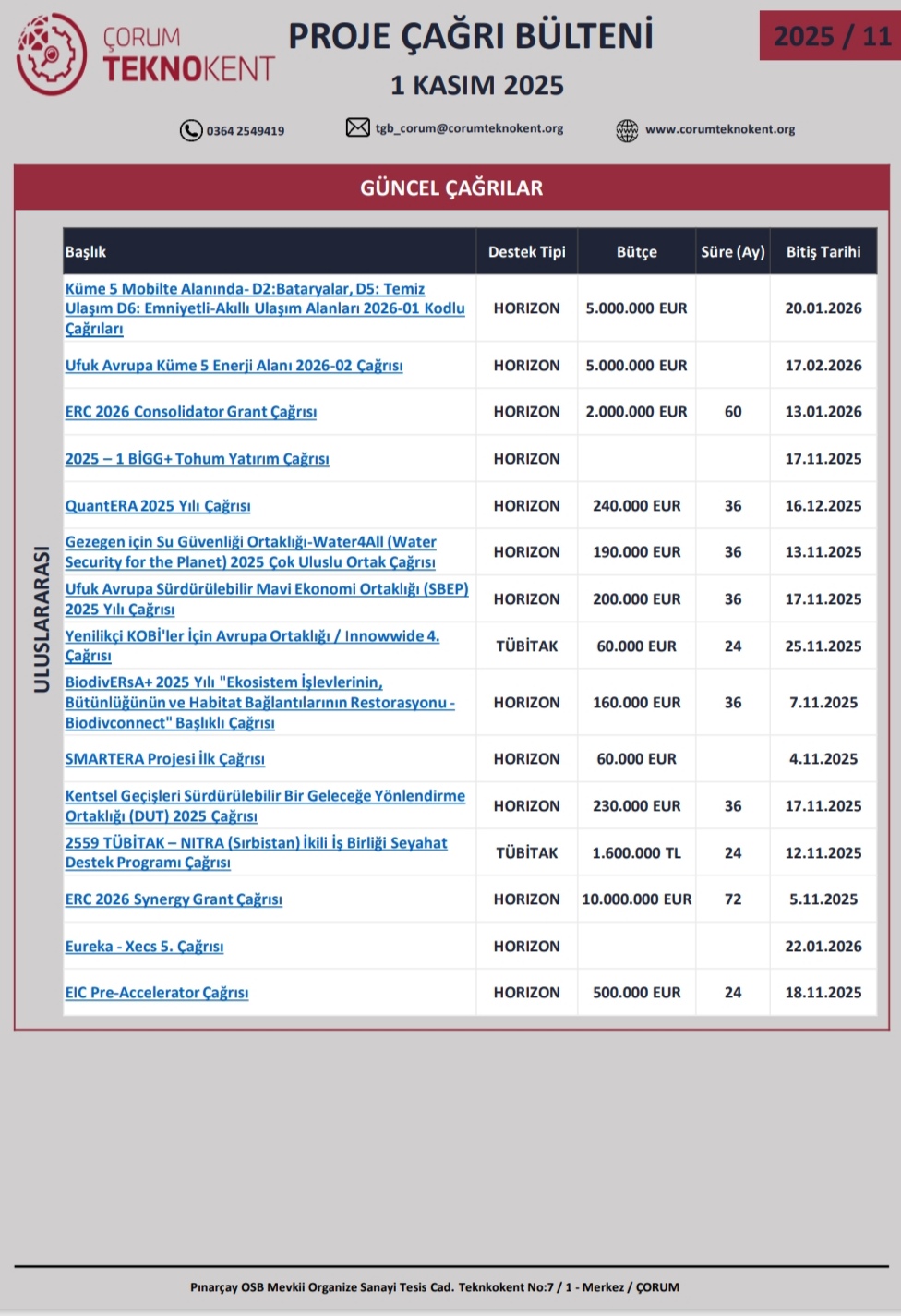 Kasım 2025 Proje Çağrı Bülteni yayımlandı.