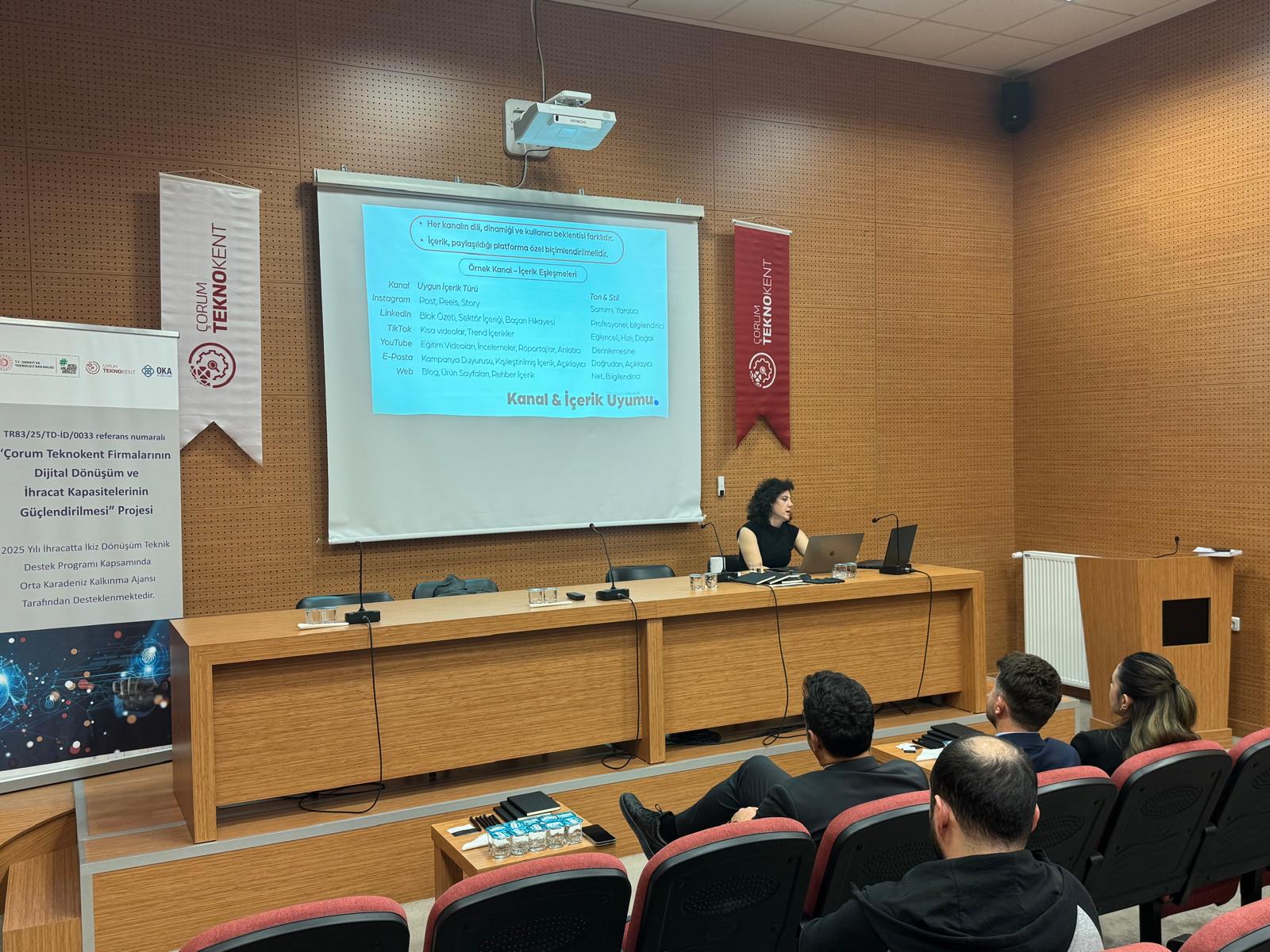 Orta Karadeniz Kalkınma Ajansı tarafından desteklenen “2025 Yılı İhracatta İkiz Dönüşüm Teknik Destek Programı” kapsamında yürütülen “Çorum Teknokent Firmalarının Dijital Dönüşüm ve İhracat Kapasitelerinin Güçlendirilmesi” projesinin eğitim bölümü ikinci gününde, Yasemin Tosun tarafından “Dijital Pazarlama” sunumu gerçekleştirildi.