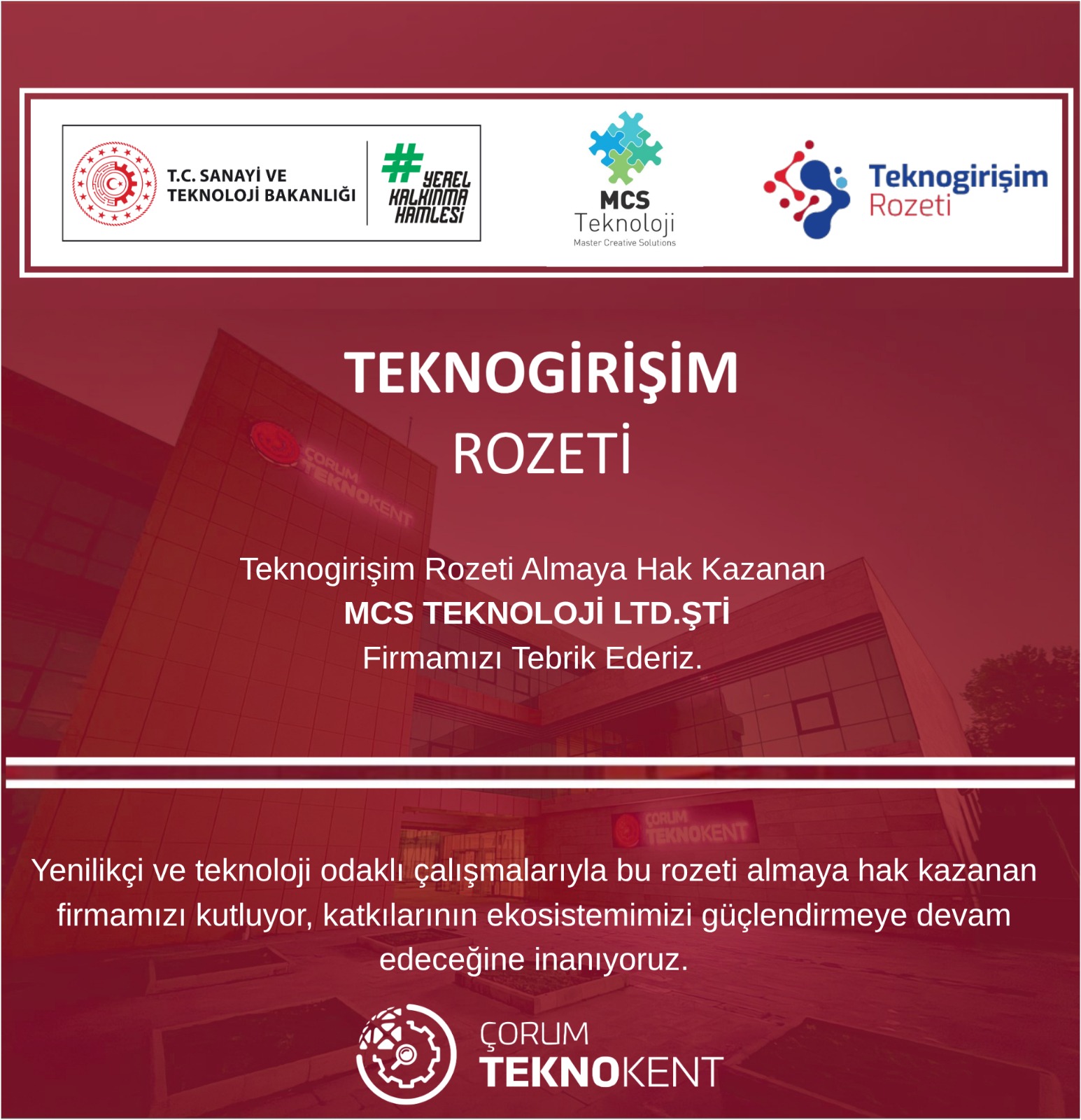 Çorum Teknokent firmalarımız Cerbeta Yazılım Bilişim Danışmanlık Sanayi ve Ticaret Ltd. Şti., Argesim Teknoloji A.Ş., Arbilgen Hücre Teknolojileri Sanayi ve Ticaret Ltd. Şti., Medu Bilgisayar Yazılım Eğitim ve Danışmanlık Ticaret Ltd. Şti., Birdanışman Danışmanlık Yazılım Otomotiv Sanayi ve Ticaret Ltd. Şti. ve Mcs Teknoloji Ltd. Şti,32945 sayılı ''Teknoloji ve Yenilik Odaklı Girişimlerin Belirlenmesi ve Belgelendirilmesine Dair Yönetmelik'' kapsamında Teknogirişim Rozeti almaya hak kazanmıştır.