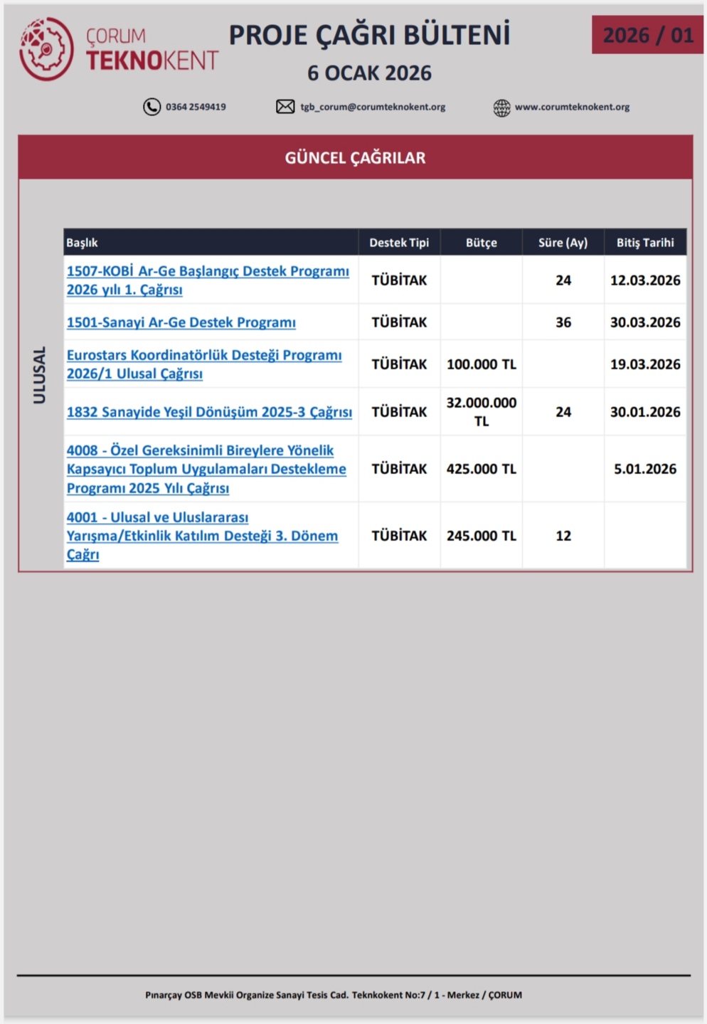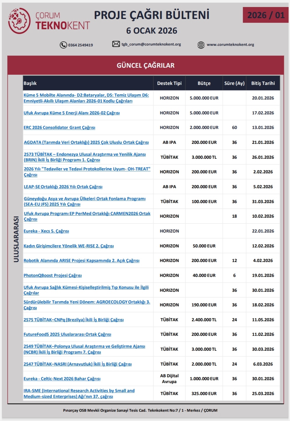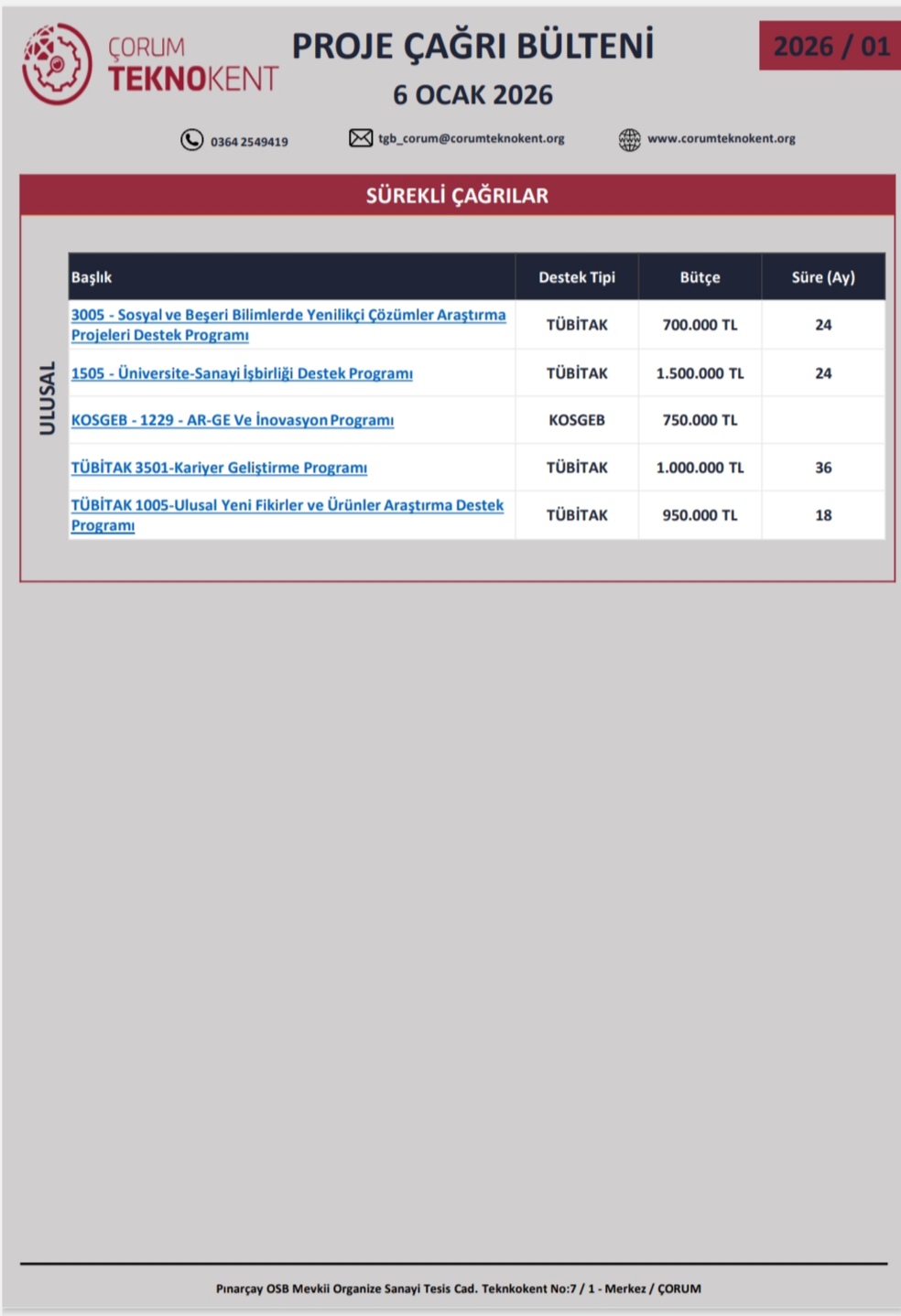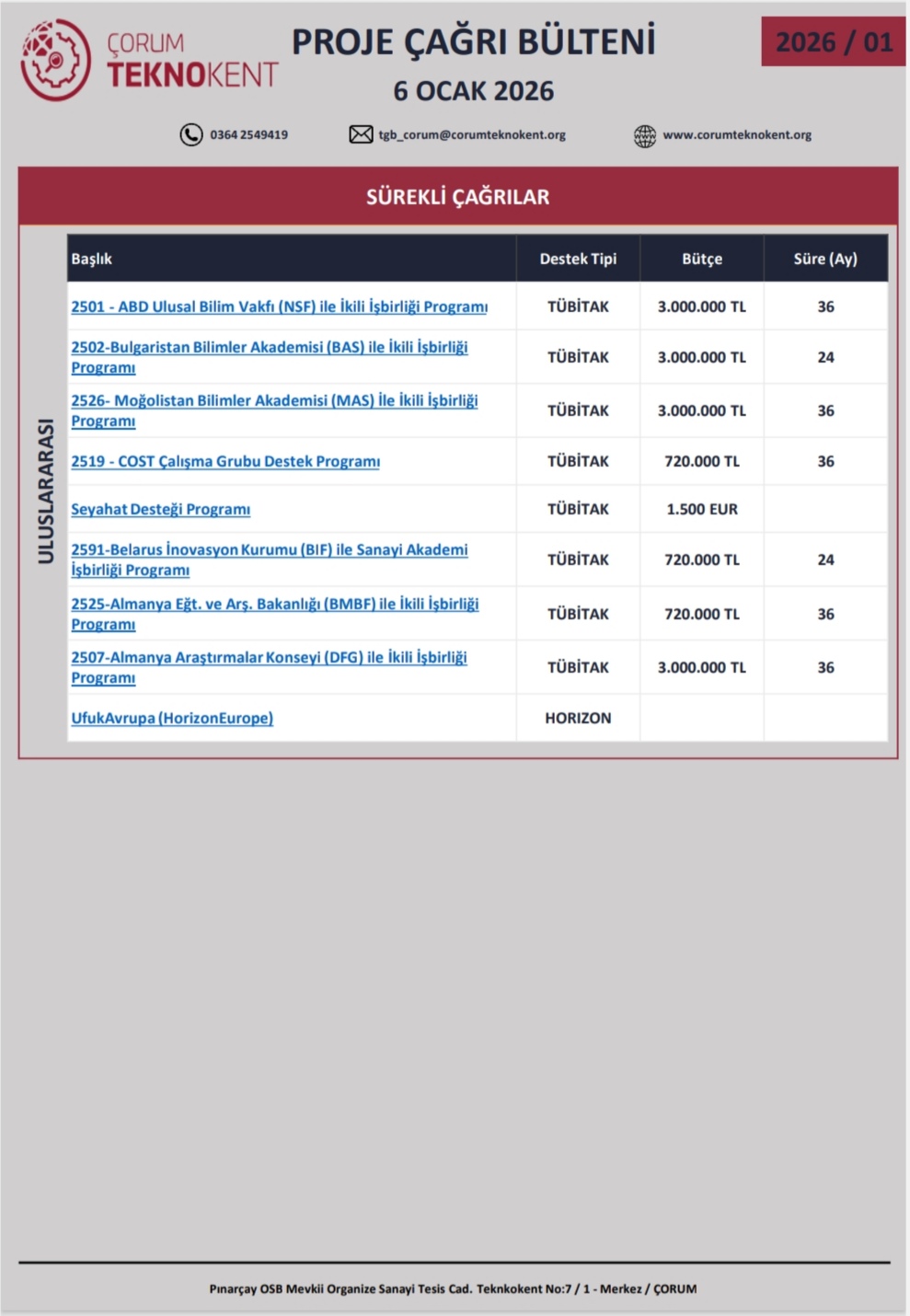Ocak 2026Proje Çağrı Bülteni yayımlandı.